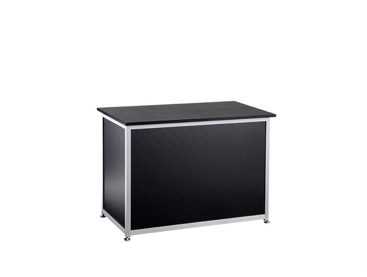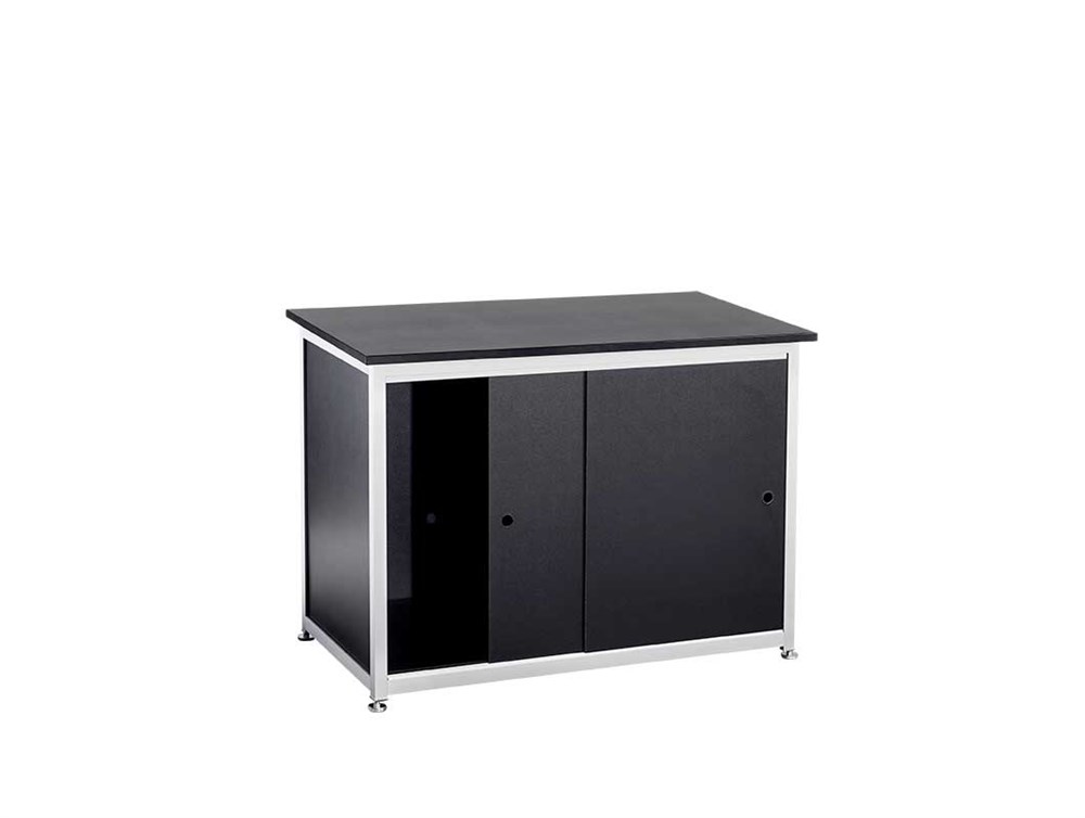 Disk, 1000x500x700mm, svart. Baksida med hyllplan och skjutdörrar, ej låsbara.