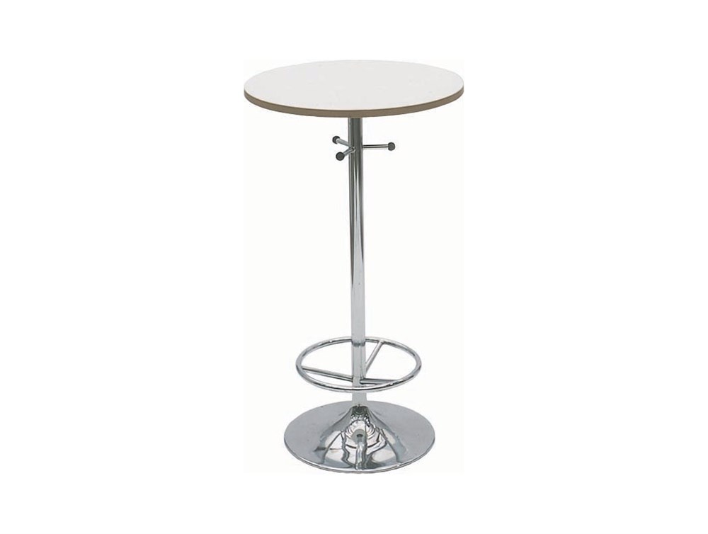 Barbord med vit skiva i trä och kromat underrede med väskhållare och fotring, 60x105cm (ØxH)